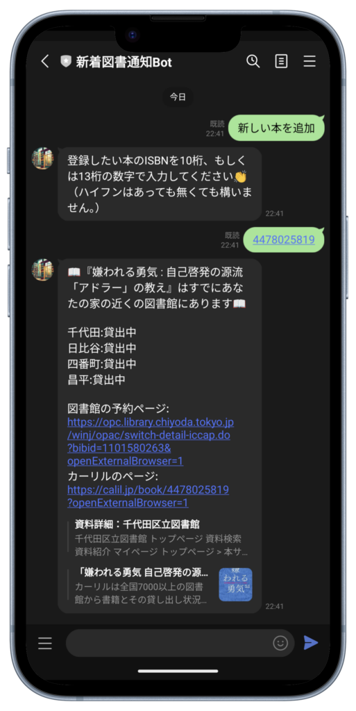 あなたの読みたい本を、新着図書通知Botに登録してみましょう。