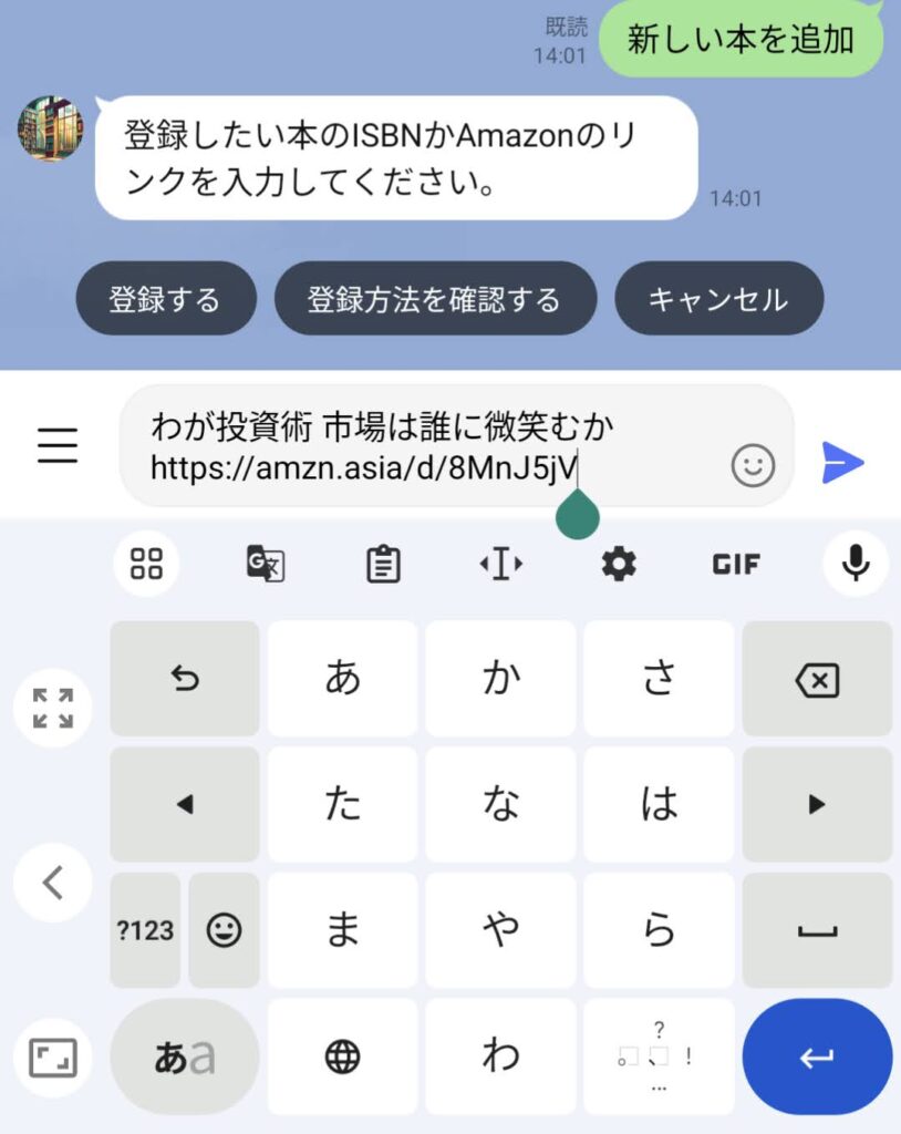 Amazonで確認したISBNをもとに、新着図書通知Botに読みたい本を登録しましょう。